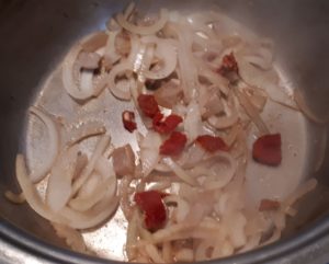 Tagliate a cubetti il lardo e fate sciogliere in una pentola alta, aggiungete una cipolla affettata e quando sarà ben imbiondita aggiungete i pomodori secchi tagliati a strisce e i ceci.