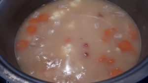 A fine cottura versate il purè di patate in modo da rendere la zuppa più densa e corposa, amalgamate bene e spolverate con della curcuma in polvere e un filo d’olio evo.