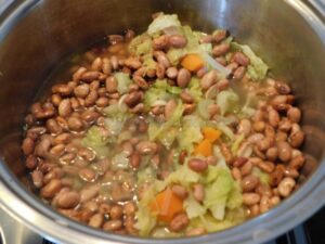 Scolate i borlotti dall’acqua di riposo, lavateli sotto l’acqua corrente e aggiunte al composto di verza, cipolla, sedano e carota, coprite di acqua e fate cuocere per 70/75 minuti, aggiungendo a metà cottura una presa di sale grosso.