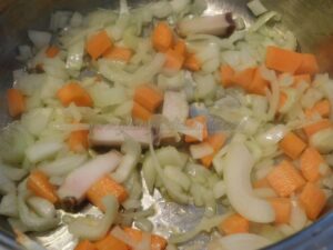 Preparate un soffritto di cipolla, pulite e tagliate a tocchetti la carota e il sedano e il guanciale tagliato a pezzetti medi, fate rosolare il tutto in un abbondante giro di olio evo.